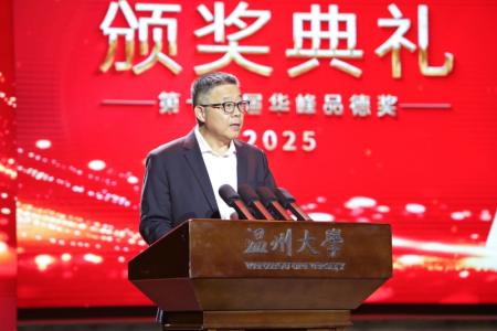 “感谢温大校领导及全体师生的精心组织与辛勤付出,让‘华峰品德奖’从一项公益品牌,内化于心、外化于行,成为师生共识认同的价值符号与精神图腾。”林建一在典礼致辞中指出,温州这片土地自古崇德向善,“华峰品德奖”既是对温大“光大国族、造福人群”的深情回应,是对温州“义利并举、经世致用”的当代赓续,更是对习近平总书记“国无德不兴,人无德不立”谆谆教诲的身体力行。