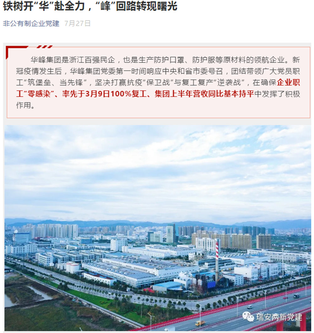 华峰集团是浙江百强民企,也是生产防护口罩、防护服等原材料的领航企业。新冠疫情发生后,华峰集团党委第一时间响应中央和省市委号召,团结带领广大党员职工“筑堡垒、当先锋”,坚决打赢抗疫“保卫战”与复工复产“逆袭战”,在确保企业职工“零感染”、率先于3月9日100%复工、集团上半年营收同比基本持平中发挥了积极作用。